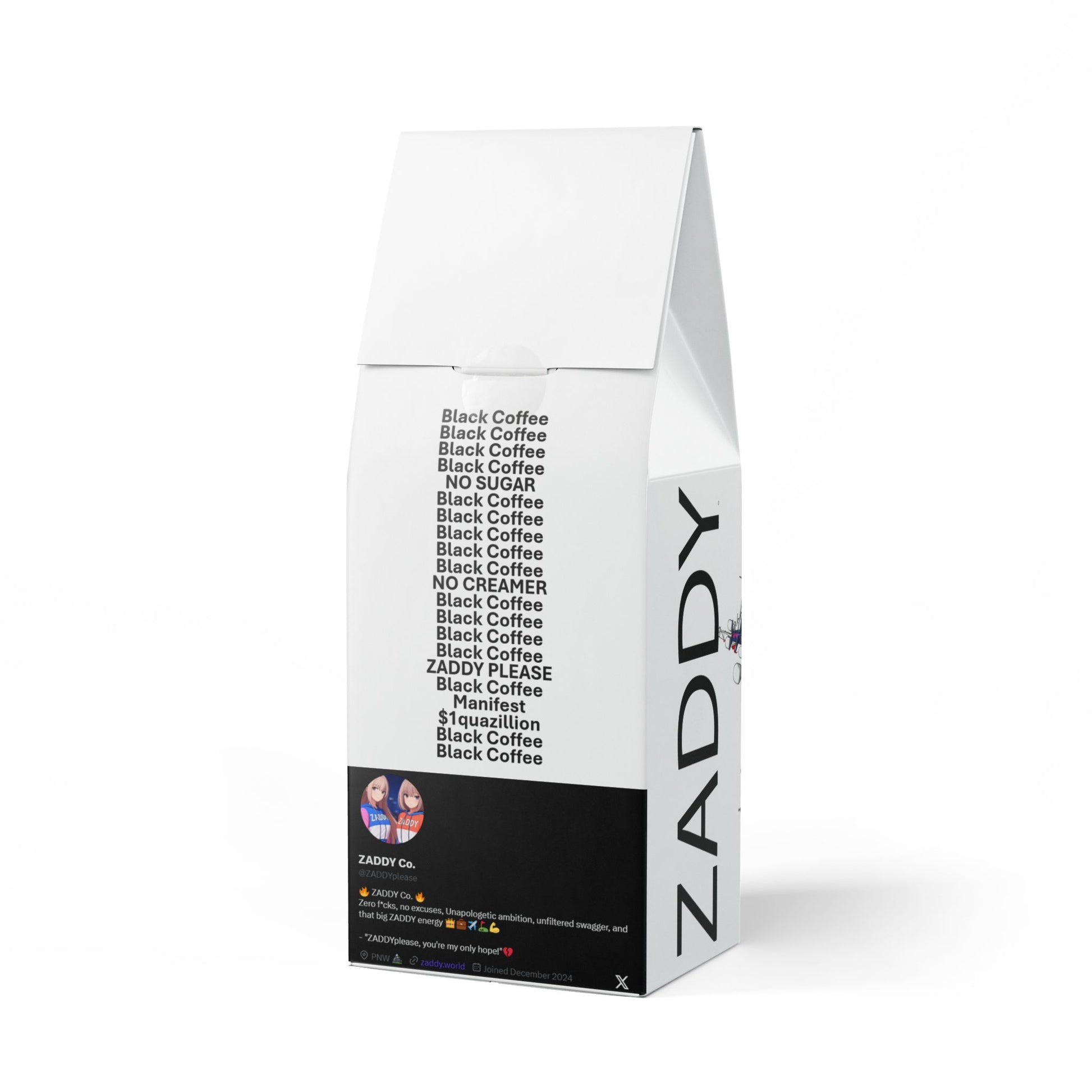 Plunge into the bold, fucking irresistible flavors of our Broken Top Coffee Blend – where chocolate-covered almonds seduce your taste buds, maple syrup sweet-talks your senses, and citrus gives you that zesty kick in the ass, all straight from the untamed wilds of Central America. This 12oz pack isn't just coffee; it's your goddamn daily ritual. Pick your poison: one hundred billion or sixety-nine trillion dollars, because at ZADDY, we're not here to tell you shit – you decide how you kickstart your day. Roasted where the hunnies are in Bend,OR USA USA USA! This blend isn't for sipping like a pussy; it's for savoring like a fucking boss. At ZADDY, we turn every moment, even your coffee break, into a declaration of your unbeatable swagger.Indulge in the delicious notes of chocolate-covered almonds, maple syrup, and citrus, sourced from the vibrant region of Central America with the Broken Top Coffee Blend; the only necessary addition to your daily routine. RULE: 5 cups a day minimum like no shit.