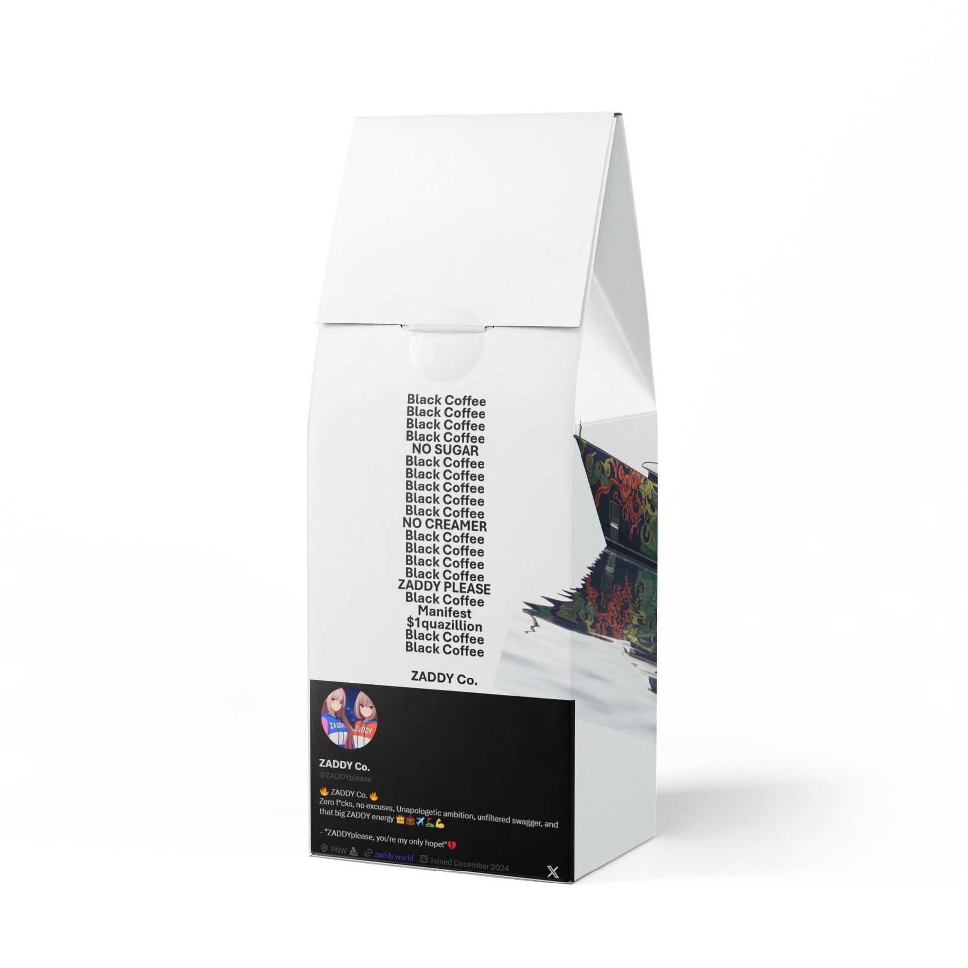 The Trapper Peak Decaf Coffee Blend; it's HAWT! This 12oz pack delivers a mellow, smooth, and savory experience, with subtle notes of peanut and milk chocolate hitting you like a gentle slap from that girl you want so bad, and a acidity so mellow it'll make you want another cup like a junkie. Sourced from the sun-kissed slopes of South America and decaffeinated (Watch out... I guess this one doesn't have too much of our fav drug) using the Swiss Water process, because at ZADDY, we keep it real even without the caffeine (I hate myself for it, but had to do it baby). Brew this shit in your drip coffee maker, French press, or percolator. Choose your grind: whole bean or ground, we've got you covered. Roasted in the land of the free, USA where the Oregon hunnies are in Bend. RULE: Even decaf deserves respect, 5 cups a day minimum, because at ZADDY, we're about the taste, and the placebo baby!